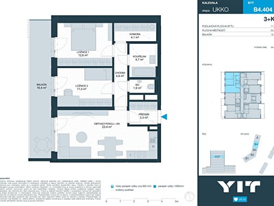 Byt 3+kk o celkové rozloze 71,8 m² je situován v 4.NP projektu KALEVALA etapy UKKO. Cena zahrnuje bytovou jednotku, sklepní kóji a DPH.