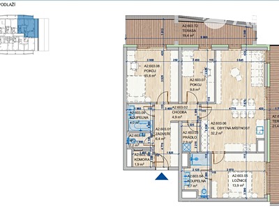 V tomto projektu nabízíme byt 4+kk 104m2 s 2 terasami, který je umístěn v 6. nadzemním podlaží. Pokoje jsou bohatě prosvětleny francouzskými okny orientovanými jižním a východním směrem. Byt je oddělen od společné chodby prostorným zádveřím s možností úložného prostoru nejen v zádveří, ale i v komoře. Koupelna vybavená vanou a dvojumyvadlem. Prostor na pračku a sušičku je v samostatné místnosti. Ložnice má vlastní koupelnu se sprchovým koutem, dvojumyvadlem a WC. Prostorný obývací pokoj s kuchyňským kout