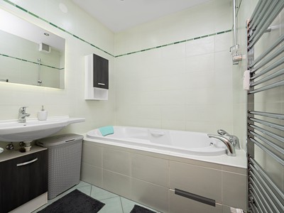 V obytných místnostech a kuchyni jsou plovoucí podlahy, na chodbě a v koupelně dlažba. Koupelna je vybavena vanou, toaleta je oddělená, což zvyšuje komfort v rámci bydlení.