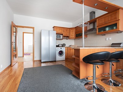 Dispozice bytu je velmi dobře řešená. Dominantou je světlý obývací pokoj s kuchyňským koutem, ze kterého je přímý vstup na balkón s příjemným a klidným výhledem. Kuchyňská linka je vyrobena na míru a je vybavena veškerými spotřebiči.