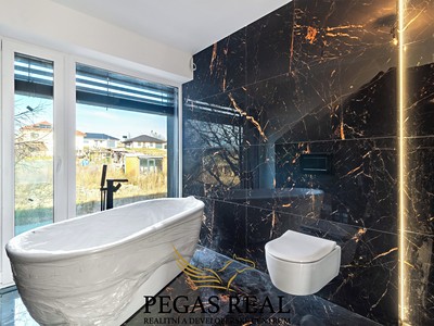 Interiér bytu je řešený ve vysokém standardu. Nechybí zde vinylové podlahy, velkoformátová dlažba v koupelně, sprchový kout typu walk-in, samostatně stojící vana, obložkové zárubně a dveře zn. Sapeli, prémiové černé vodovodní baterie zn. Hansgrohe, luxusní sanitární keramika zn. Villeroy & Boch, černé designové doplňky nebo led podsvícení. Z velkého obývacího prostoru bytu je přístup na terasu se skleněným zábradlím s výhledem do okolí.