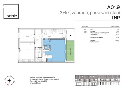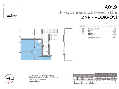 V rámci II. etapy výstavby projektu v ulici Nová v Kouřimi Vám nabízíme byt A01.9, 3+kk v 1. a 2. NP / podkroví, s plochou bytu 70 m2 a zahradou o výměře 42 m2. Všechny nabízené byty jsou cihlové, energetická třída B, velmi úsporné. Při výstavbě je kladen důraz na kvalitní provedení. Byty jsou v rozmezí 48 m2 až 95 m2. Ke každému bytu je v ceně parkovací stání na vlastním pozemku, zahrada nebo terasa. Každý byt má vlastní vodoměr a elektroměr. Standardy zahrnují plastová okna s trojskly, v obývacím pokoji je otevírání na posun, veškeré místnosti mají podlahové vytápění, některé vnitřní dveře jsou také na posun do pouzdra. Na konečné podobě bytů se můžete v průběhu výstavby sami podílet a byt tak bude dokončen Vám přímo na míru. Je možné k bytu přistavět zimní zahradu a z parkovacího stání postavit garáž. V Kouřimi je plnohodnotná občanská vybavenost - MŠ, ZŠ, ZUŠ, městský úřad, stavební úřad, praktičtí lékaři, gynekolog, veterinář. Je zde možnost nakoupit v různých obchodech na náměstí a v přilehlých ulicích. Ke sportování je možné využít jak rozmanitého terénu v okolí Kouřimi, tak je k dispozici sportovní