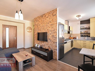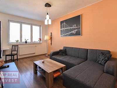 Byt nabízí užitnou plochu 72 m² včetně příslušenství a zaujme především svou praktickou dispozicí a dostatkem úložného prostoru. Dominantou bytu je obývací pokoj propojený s kuchyňským koutem, odkud je přístup do dalších neprůchozích pokojů.