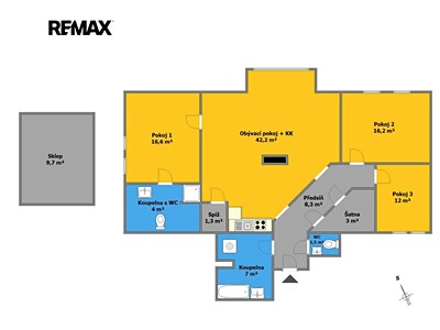 Dispozice dále zahrnuje vstupní chodbu s komorou (šatnou), tři neprůchozí pokoje, dvě koupelny, samostatné WC a spíž přímo v kuchyni. Velkým benefitem je tedy nadstandardní množství úložného prostoru.