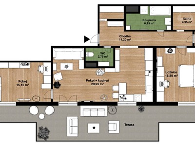 Velkým benefitem je prostorná terasa o výměře 36,2 m2, která se do podlahové plochy nezapočítává.