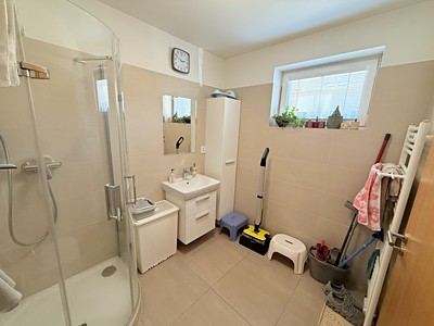 Přízemí : Vstup do domu začíná velice útulnou předsíní kombinovanou se vstupní halou oddělenou od zbytku domu. Zde se po pravé části prochází do plně vybavené koupelny se sprchovým koutem a toaletou. Na levé straně je zase vstup do pokoje, který je v současné době využit, jako větší šatna, avšak jeho využití záleží na potřebách majitele domu, je opět plně vybaven úložnými prostory a francouzským oknem a výstupem do exteriéru domu. Při vstupu do obývací části nás uvítá obývací pokoj s krbovými kamny, navazující na elegantní kuchyni, osazenou kvalitními spotřebiči, včetně spíže oddělené dveřmi a s šuplíkovým mrazákem a lednicí. Dále je v obývacím pokoji několik výstupů na z
