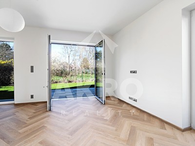 Dispozice: vstupní chodba s denním světlem, hala s nikou pro velkou šatní skříň + šatna s oknem, samostatná toaleta s integrovaným sprchovacím WC Aqua Clean Geberit – základní funkce přes dálkové ovládání nebo pomocí aplikace přes telefon. Do centrální obytné místnosti je vstup přes skleněné posuvné dveře do pouzdra. Denní zóna propojuje kuchyň se spíží, jídelní kout a obývací pokoj do jednoho otevřeného prostoru plného světla se vstupem na terasu a dále do prodlouženého, rozšířeného (zeleného pokoje) – zahrady, která je oddělena od ulice již vzrostlým živým plotem a poskytuje příjemné soukromí. Velká balkonová okna v obývací části stírají hranici mezi interiérem a exteriérem.