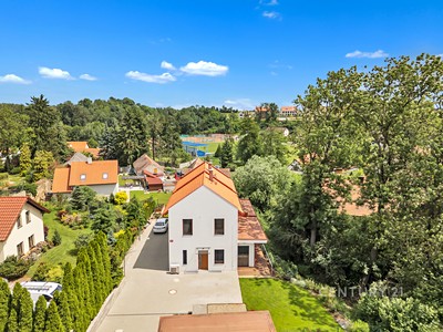 Velkým plusem je suterén, který má plnohodnotnou plochu a dá se využít podle potřeby – pracovna, zázemí pro podnikání, herna nebo úložný prostor. V celém domě, včetně suterénu, je podlahové vytápění. Nechybí příprava na krbová kamna ani půda pro uložení věcí.