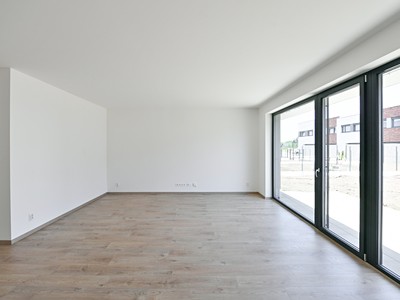 V přízemí se nachází prostorný obývací pokoj (26,3 m²) propojený s kuchyňským koutem (6,0 m²) a vstupem na terasu a zahradu.