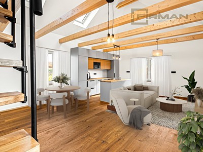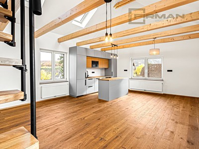 Horní byt zaujme otevřeným obývacím prostorem s novou kuchyní, vysokými stropy a přiznanými trámy. Samozřejmostí jsou moderní spotřebiče a dálkově ovládané střešní žaluzie. Součástí je také podkrovní místnost vhodná jako ložnice, pracovna nebo úložný pr
