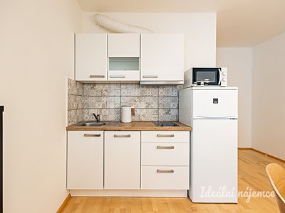 Obývací pokoj společný s kuchyňským koutem je vybaven rohovou pohovkou, jídelním stolem a televizním stolkem vč. TV. Ložnice je vybavena postelí vč. matrace . Byt se nabízí zařízený tak, jak vidíte na fotografiích. Díky orientaci do vnitrobloku (na druhou stranu od rušné ulice Olšanská) je byt opravdu velmi klidný a tichý.