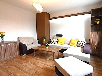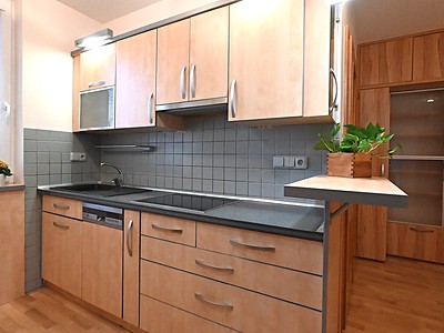 Vybavení: kuchyňská linka, myčka, trouba, mikrovlnná trouba, varná deska, digestoř, pračka, vestavná skříň, nábytek v obývacím pokoji.