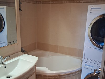 Koupelna je vybavená rohovou vanou a nabízí dostatek místa pro pračku i
