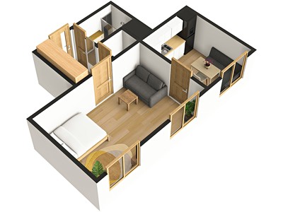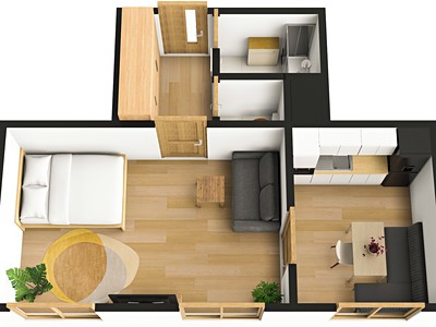 Velkou předností bytu je jeho praktická dispozice a plnohodnotné využití prostoru. Ve vstupní části jsou k dispozici vestavěné skříně, dále samostatné WC s umyvadlem, koupelna se sprchovým koutem a pračkou, prostorný hlavní pokoj s přirozeně oddělenou spací a obývací zónou a samostatná kuchyň. Celková podlahová plocha bytu činí 37 m², včetně koje o výměře cca 1,7 m².